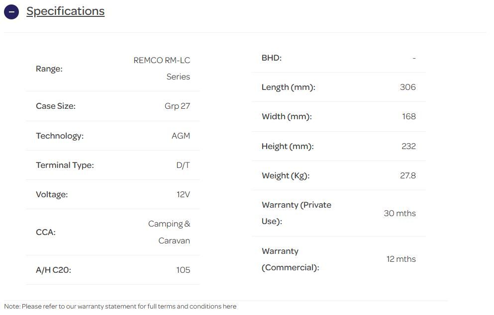 12V 105AH REMCO LC AGM DEEP CYCLE GRP 27 D/T 306MM X 168MM X 220MM